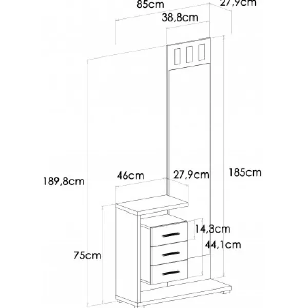 Original, moderno y económico. Así este mueble de entradita o recibidor compuesto por un taquillón con tres cajones que parecen suspendidos en el aire. También dispone de un magnifico espejo de cuerpo entero que completa un mueble de entrada perfecto. Los herrajes son metálicos. Se puede elegir entre dos colores: cambria completo o cambria-blanco, colores ideales para que vaya a juego con los salones de nuestra web. Fabricado en melamina de alta calidad. Tipo de mueble KIT. Servicio express disponible.