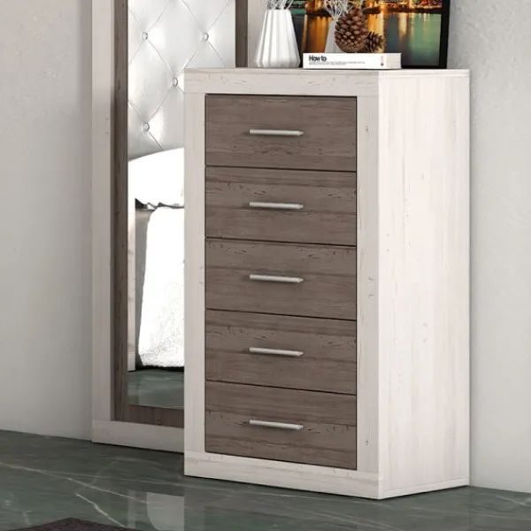 Moderno sinfonier de cinco cajones con marco perimetral ideal para ambientes actuales. Se combina a la perfección con los dormitorios de la serie Lara que puede encontrar en nuestra página. Adquiera el mural con luna de forma opcional en el catálogo de la web para completar el conjunto. Disponible en andersen pino-gris, cambria-grafito y cambria-blanco. MUEBLE KIT.