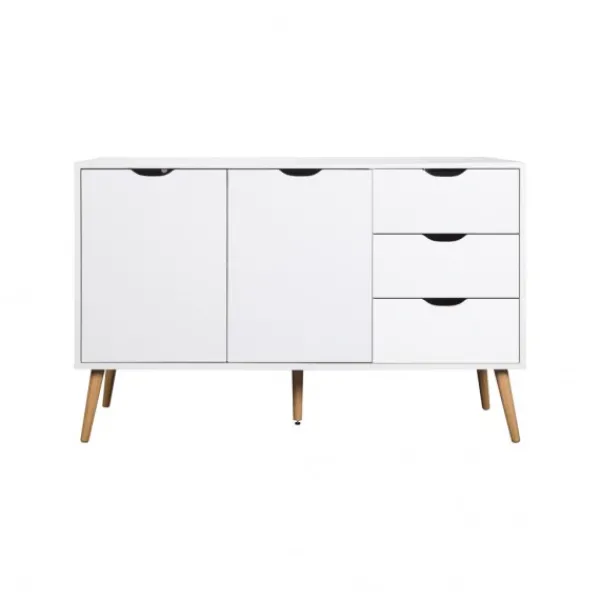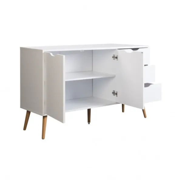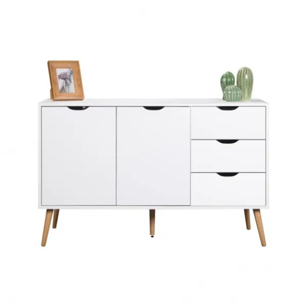 Aparador Fiano, con dos puertas y 3 cajones. Perfecto para ordenar y guardar cualquier cosa. Su pata alta de madera le da un aire natural, nórdico, a la vez que permite una fácil limpieza del suelo. Linea moderna, natural, ideal para cualquier rincón de la casa. ENVÍO GRATIS