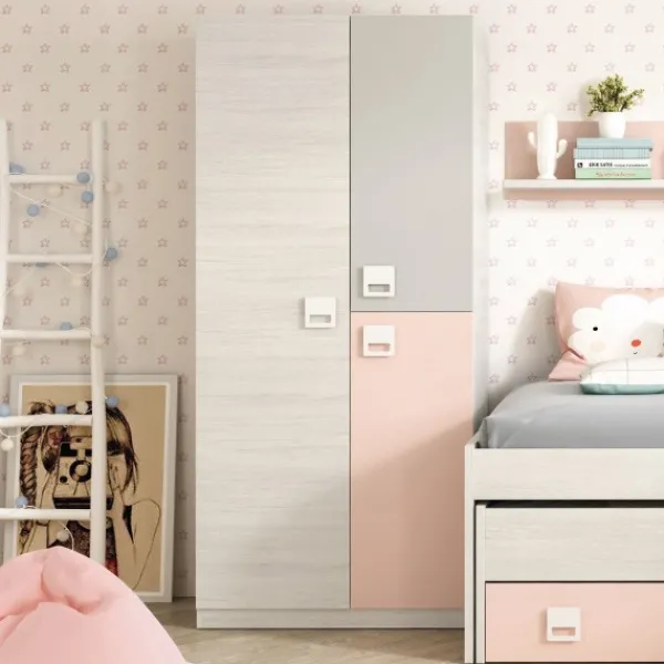 Armario de tres puertas con tiradores en asa, con una combinación de color formada por blanco line (veteado), rosa pastel y gris.