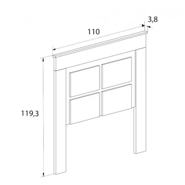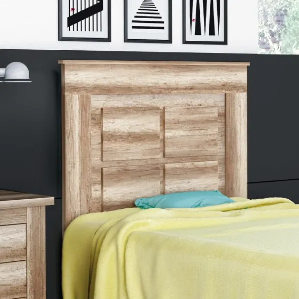 Cabecero de madera, para dormitorios juveniles, con patas del modelo Chellén. Original dibujo con relieves cuadrados en el plafón. Mueble KIT