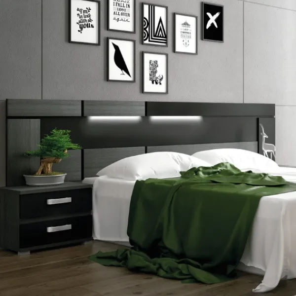 Conjunto fabricado en melamina de gran calidad, formado por dos mesitas y cabecero con leds, todo ello en combinación de color ceniza-negro.