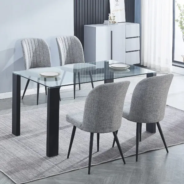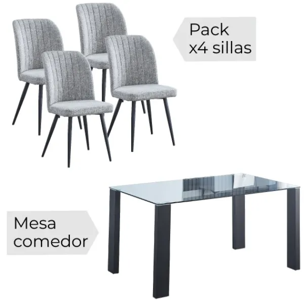 Precioso conjunto Alice compuesto por una mesa fija de comedor con una tapa de cristal templado transparente y patas en negro, junto un juego de 4 sillas modelo rory, disponibles en beig o gris. Formato KIT.