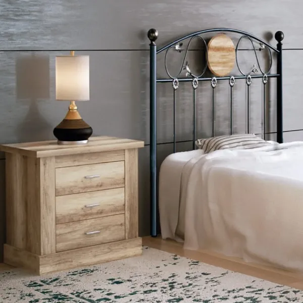 Dormitorio compuesto por mesita de noche de tres cajones, y un cabecero de forja negro con una galleta decorativa a juego con la mesita. Se sirve en KIT. Tablero de aglomerado con chapa sintetica y melaminizada (16 y 32mm.). Cabecero de forja con pintura electrostática.