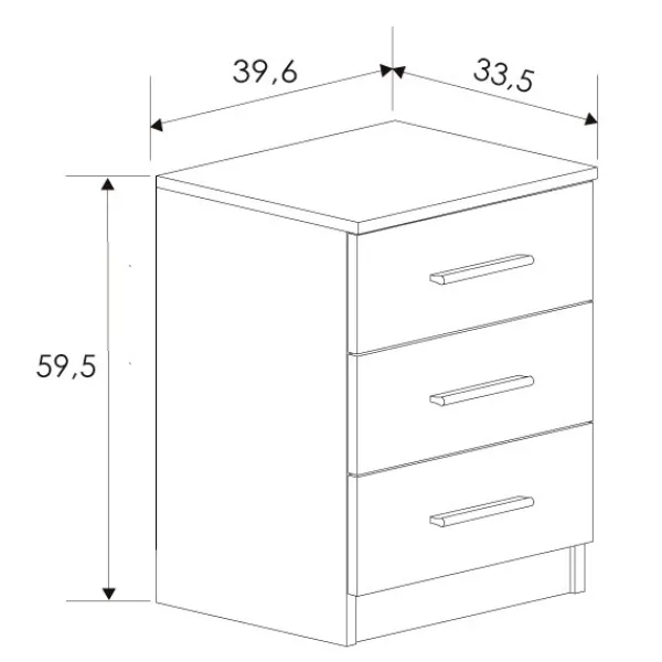 Mesita de noche 3 cajones aura sencilla y elegante, con tirador en negro que contrasta con el resto del mueble. También disponible en 2 cajones. Puede combinarlo con la serie Aura disponible en nuestra web. Disponible en dos colores. Mueble KIT