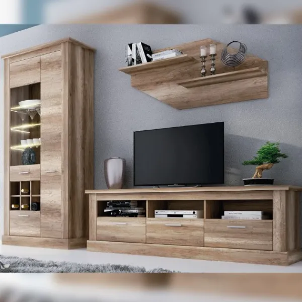 Composición de salón compuesta por un bajo TV de tres cajones y tres huecos, una vitrina alta con luces leds y un respaldo con dos estantes con forma achaflanada. Mueble KIT