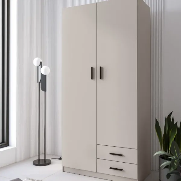 Armario 2 puertas con 2 cajones aura. Ideal para cualquier ambiente de su hogar. Puede combinarlo con la serie Aura disponible en nuestra web. Disponible en color beig y mauvella. Mueble KIT