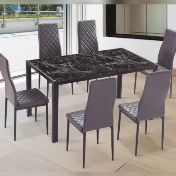 El conjunto incluye una mesa fija de cristal templado con un estampado similar al marmol y las patas metálicas pintadas en negro.