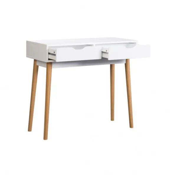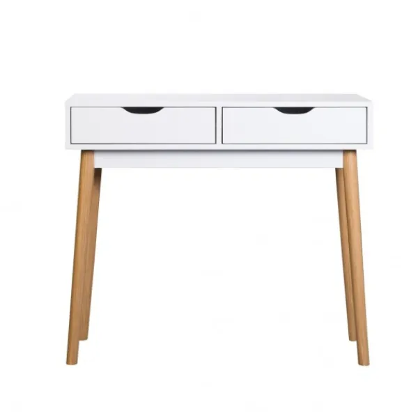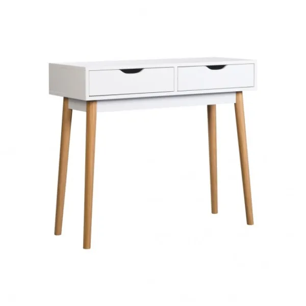 Recibidor FIANO, con pata alta, y dos cajones. En acabado de melamina blanco de 15 mm. y patas de pino barnizadas. Combinación de colores moderna, adaptable a cualquier linea de decoración, perfecto para vestir ese espacio que te queda en el pasillo o entrada de la casa. ENVÍO GRATIS