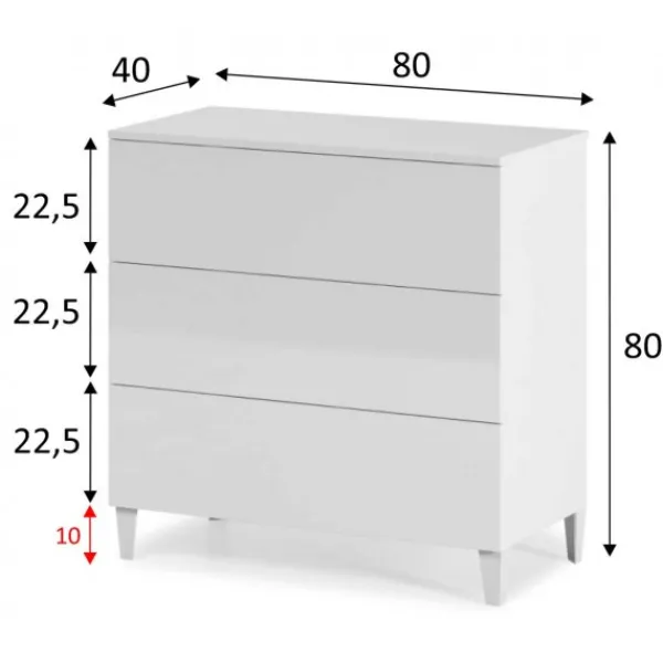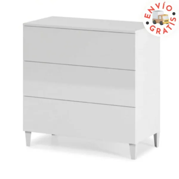 Cómoda sencilla de tres cajones. Se trata de la serie Diva que reúne tres artículos con los que crearás el dormitorio de tus sueños. En este caso te mostramos la cómoda pero en web podrás encontrar cómoda de cinco cajones y mesita de noche. De color blanco brillo y tipo KIT.