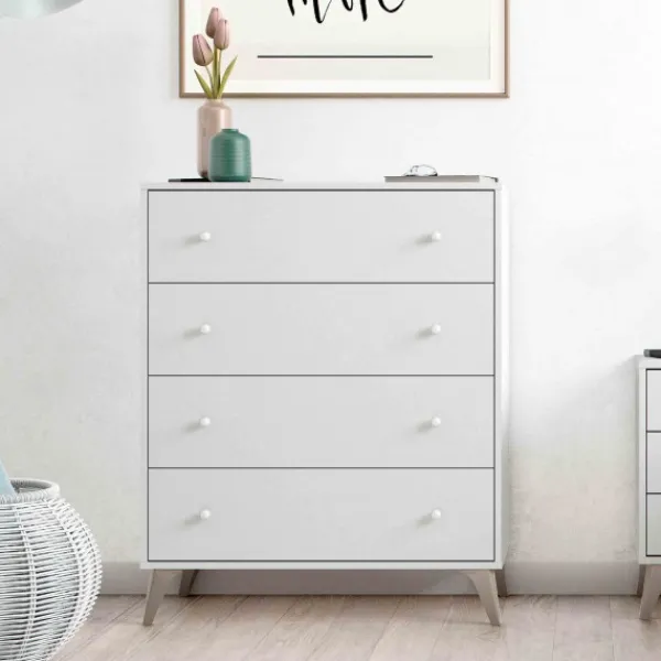 Preciosa cómoda de estilo nórdico, con cuatro cajones espaciosos y un diseño muy chulo. Es de color blanco artik. Además, puedes completar tu pedido con el conjunto de cabecero y mesitas de la misma serie.