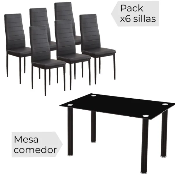 Económico y moderno conjunto de mesa cristal + seis sillas disponibles en color negro. Diseño y confort para tu salón.