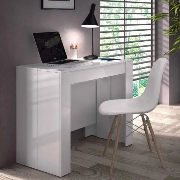 Consola extensible de uso muy amplio. Puedes ponerlo de recibidor, de escritorio, mesa de comedor, cocina, etc. Se ajustará a tus necesidades seguro ya que puedes ponerlo de 5 posiciones diferentes. Es de color blanco con acabado brillo. Envío GRATIS.