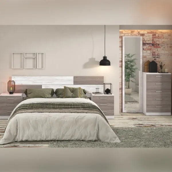 Dormitorio de matrimonio Monika 01 en color andersen pino – gris, con un diseño actual, y un colorido moderno. Compuesto por cabecero de 220cm, dos mesitas, un espejo y un sinfonier de 5 cajones. Formato KIT. Fácil montaje.