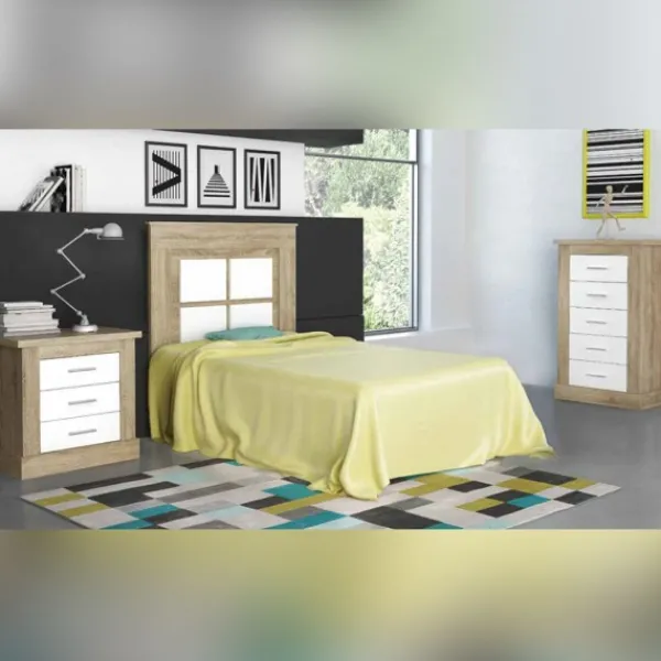 Dormitorio compuesto por mesita de noche de tres cajones, un cabecero preparado para camas de 90 y 105cm. y un gran sinfonier de cinco cajones ideal para complementar el ambiente. Se sirve en KIT. Tablero de aglomerado con chapa sintetica y melaminizada (16 y 32mm.).