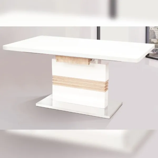 Mesa de comedor extensible rectangular con tapa de DM lacado blanco brillo y ala central forrada de color cambria, las patas son de DM lacado en blanco brillo y la pieza central está forrada en color cambria. La base también es de DM forrado en acero inoxidable.