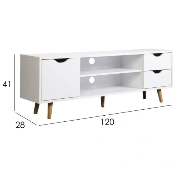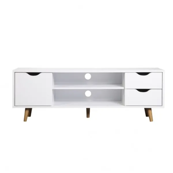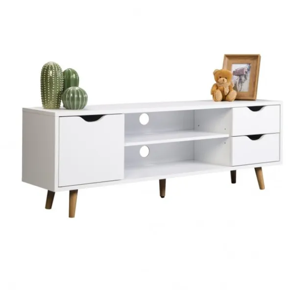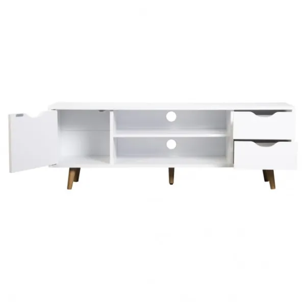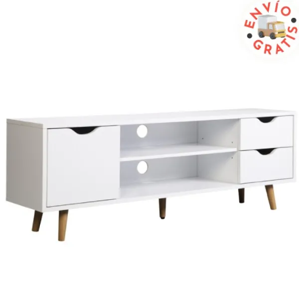 Mesa de televisión Fiano, con una puerta, dos huecos y dos cajones. Perfecto para ordenar y guardar cualquier cosa. Su pata alta de madera le da un aire natural, nórdico, a la vez que permite una fácil limpieza del suelo. Linea moderna, natural, perfecta para ese pequeño salón con carácter. ENVÍO GRATIS