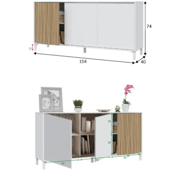 Mueble aparador de 3 puertas con estantes interiores con patas. Funcional, practico y tan bonito que será el mueble estrella en cualquier estancia de la casa. Perfecto para almacenar todo lo que necesites. Encuentra el salón a juego en nuestra web. MUEBLE KIT.