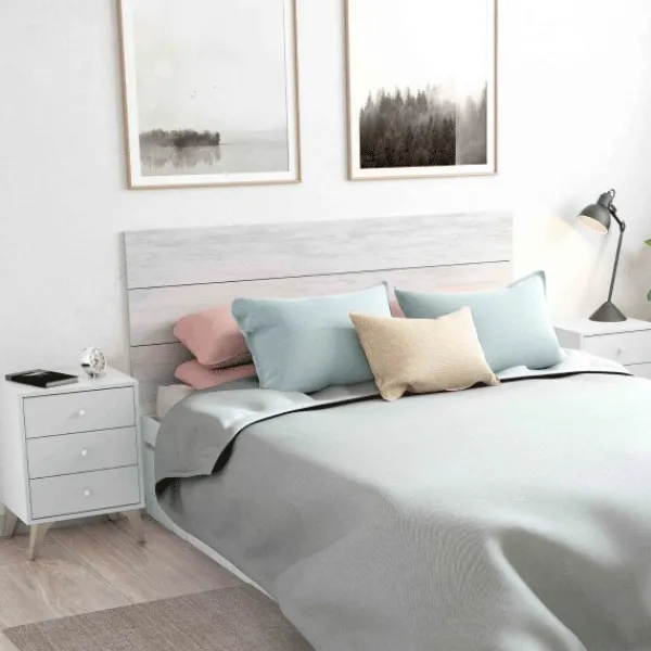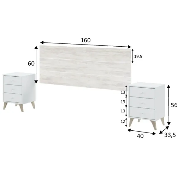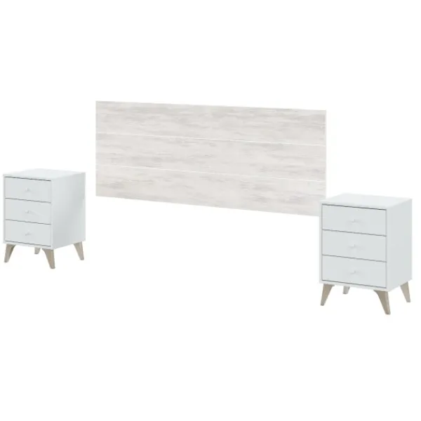 Precioso conjunto de estilo nórdico compuesto por un cabecero y dos mesitas de tres cajones. Combina dos tonos de blanco artik y velho. Mueble tipo KIT.