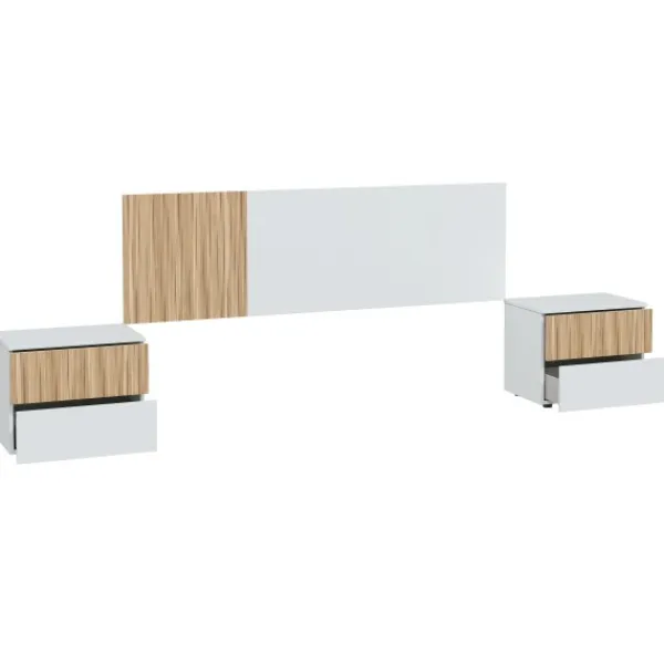 Completa y decora tu dormitorio con el modelo Ethna, compuesto por el cabecero de 160cm, dos mesitas de dos cajones y el sinfonier de 5 cajones. Disponible en blanco artik y natur. MUEBLE KIT.
