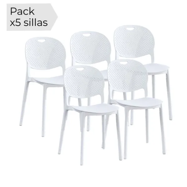 El juego de 5 sillas Jasen es ideal para cocinas o exterior, por su comodidad y su facilidad para limpiarlas. Disponibles en color blancos. En la web también estará disponible junto a la mesa Jasen.