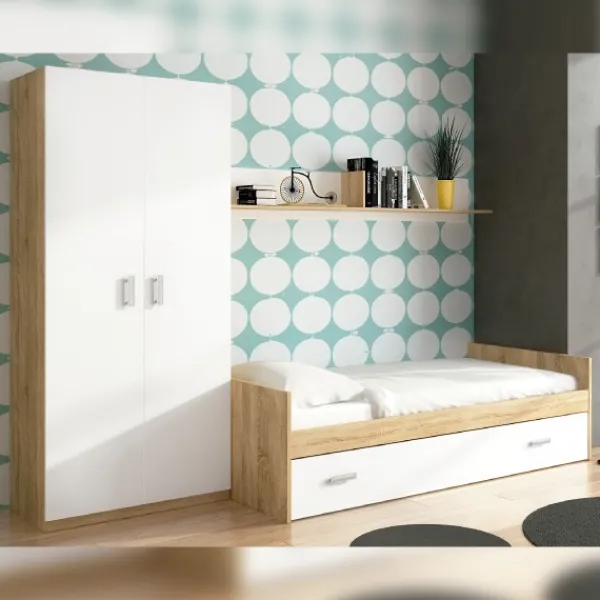 Dormitorio juvenil formado por un armario de dos puertas abatibles, cama nido, estante de 202cm. y somier de arrastre para la cama inferior. Disponible en una preciosa combinación de cambria -blanco. Mueble KIT.