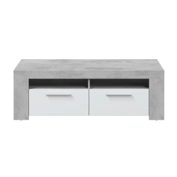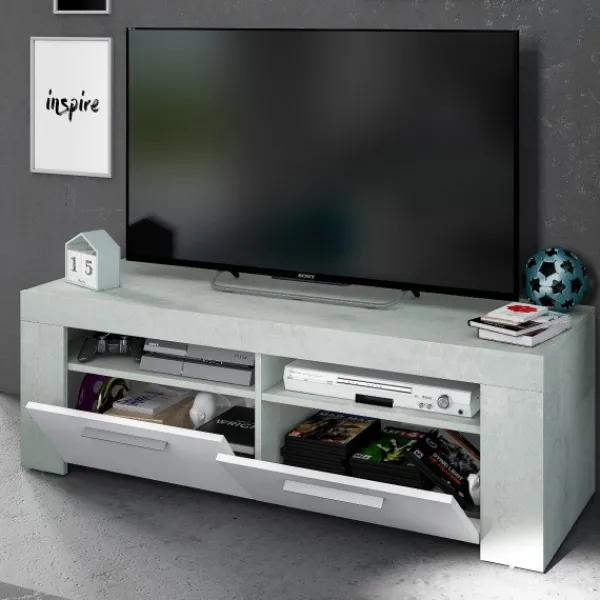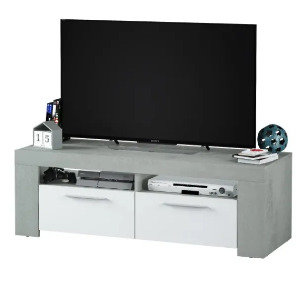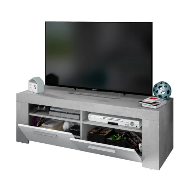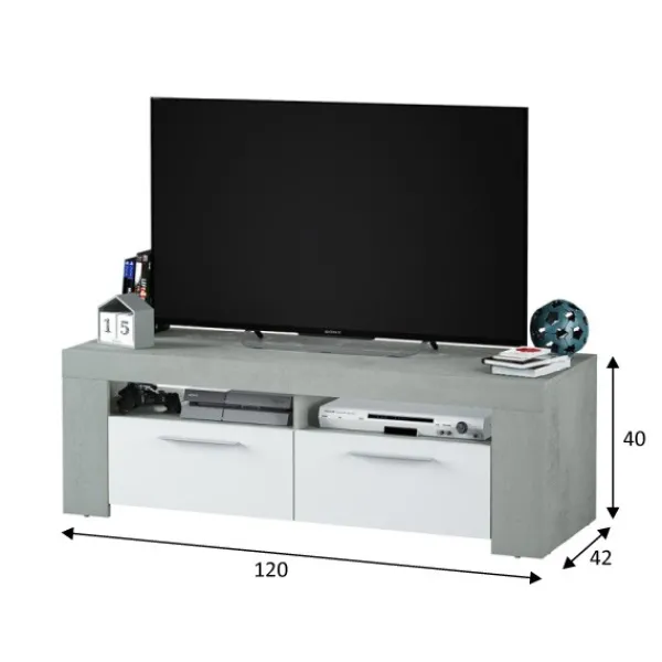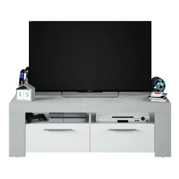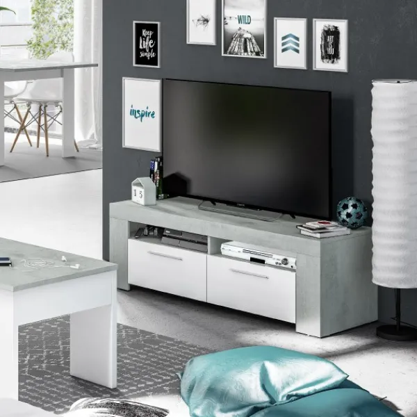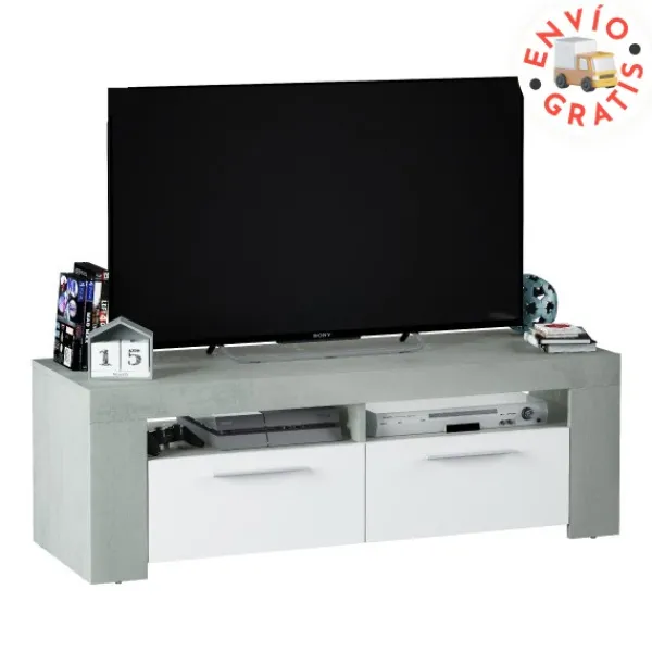 Mueble de televisión Urban de 120cm con 2 puertas y dos huecos en la parte superior. Diseño sencillo, minimalista y elegante. En color cemento y blanco artik. ENVÍO GRATIS